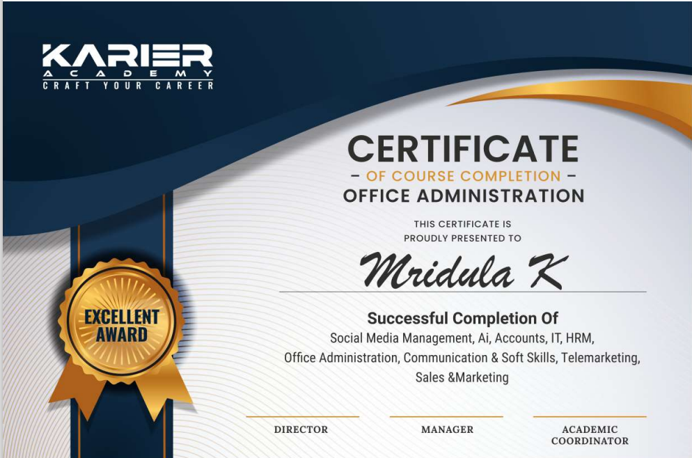 Join karier academy for the office adminstration course in manjeri was a career chancing decision. I was a complete beginner, bust their structured program and expert teachers transformed me into a confident professionl. The most impressive part is their commitment to placement. They helped me start my career right the course. I'm so grateful and highly recommend them.